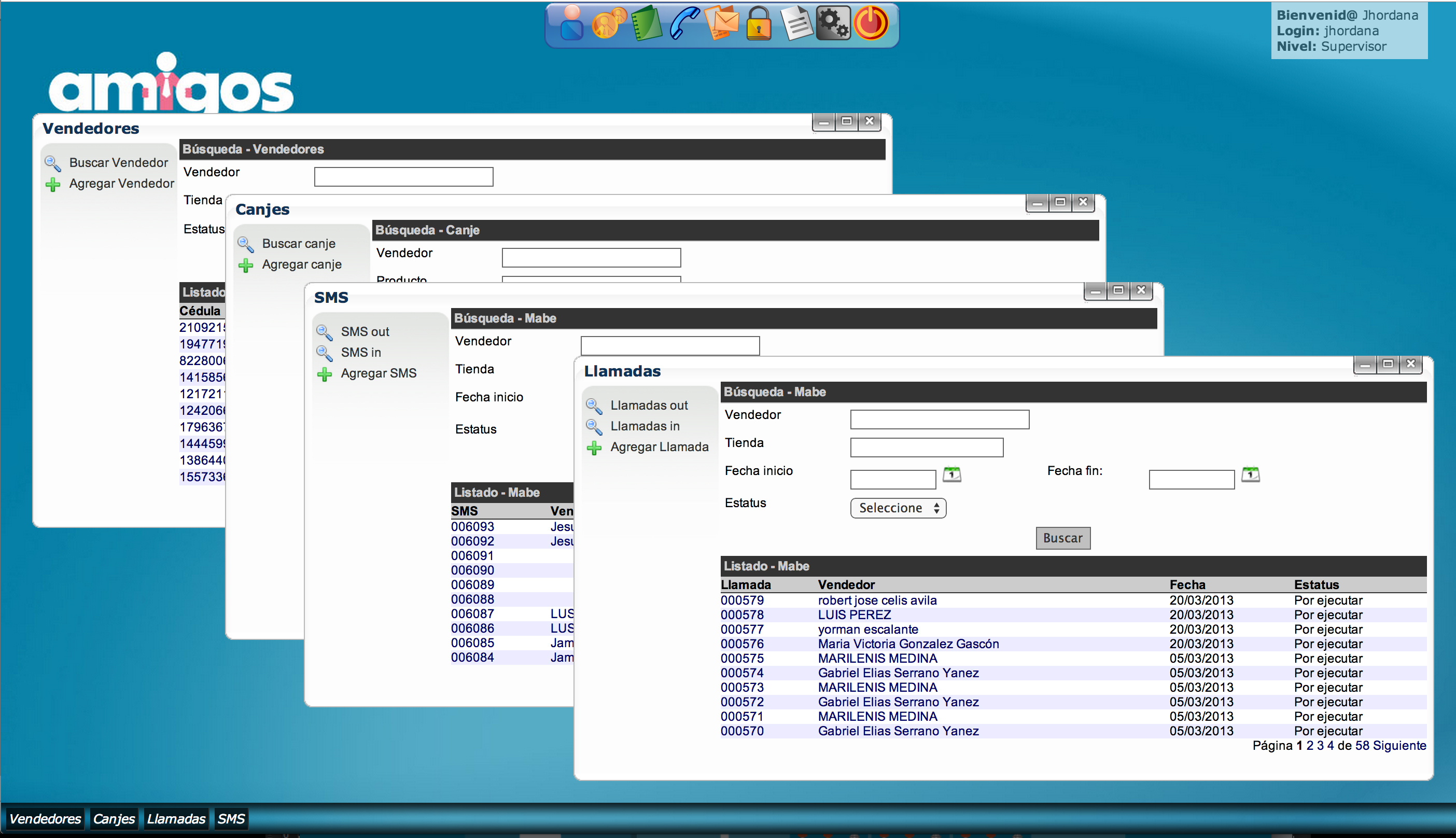 La parte administrativa del sistema tiene módulo de Call Center con llamadas entrantes, salientes, gestión de eventos, aprobación o negación de facturas, gestión de puntos acumulados, envíos de mail y sms masivos, y segmentación vendedores por tiendas, estados, regiones o ventas.