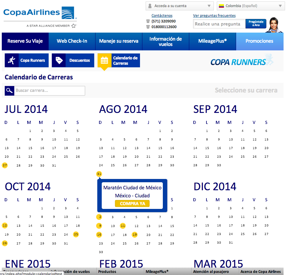 Finalmente, el usuario solo debía elegir las fechas previstas en la campaña Copa Runners, todas enfocadas en maratones, y disfrutar de un descuento en la compra de su tiquete.